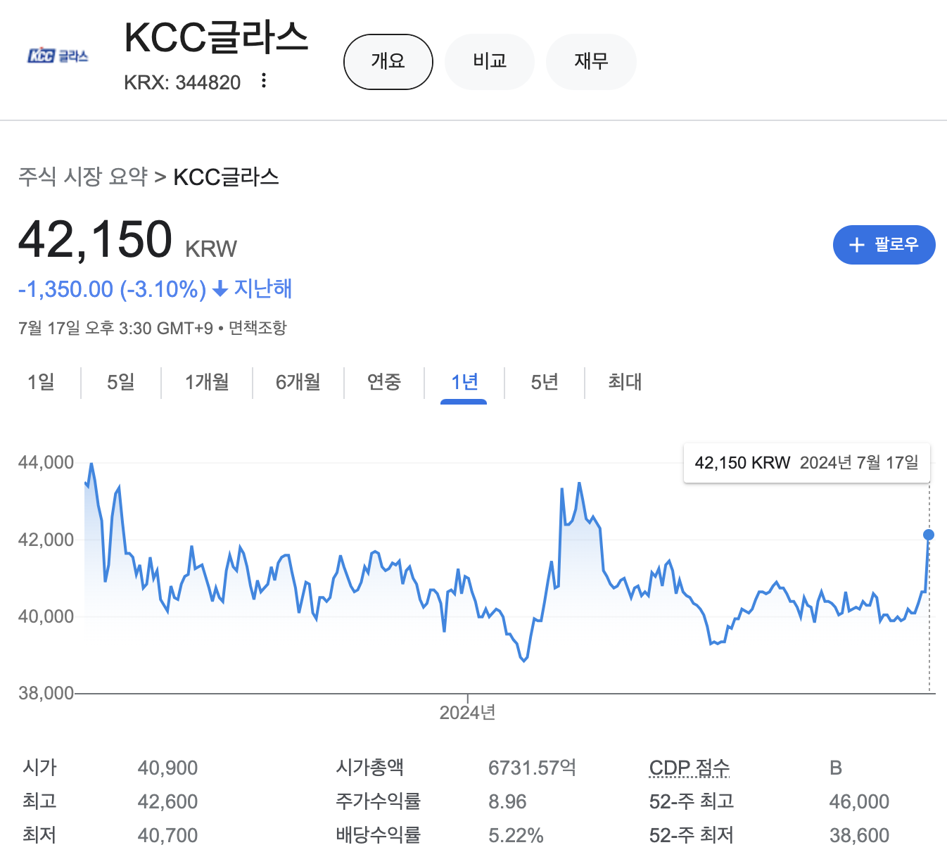 KCC글라스의 주가는 지난해 1년대비 -3.10% 하락해 있는 상태입니다.