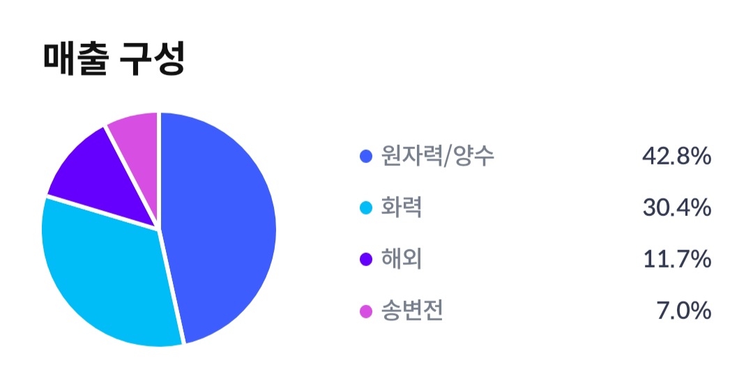 한전KPS는 원자력/양수 42.8%, 화력 30.4%, 해외 11.7%, 송변전 7.0%의 매출 구성을 하고 있습니다. 50%의 가까운 원자력/양수 42.8%가 구성하고 있습니다.