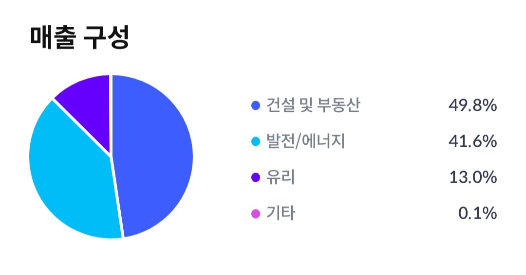 SGC에너지는 건설 및 부동산 49.8%, 발전/에너지 41.6%, 유리 13.0%, 기타 0.1%의 매출 구성을 하고 있습니다. 이 회사의 매출은 발전. 에너지, 건설 및 부동산, 유리 등 다양한 사업 부문에서 발생하며, 이들 사업 부문은 서로 다른 시장 동향과 영향 요인에 따라 변동할 수 있습니다.