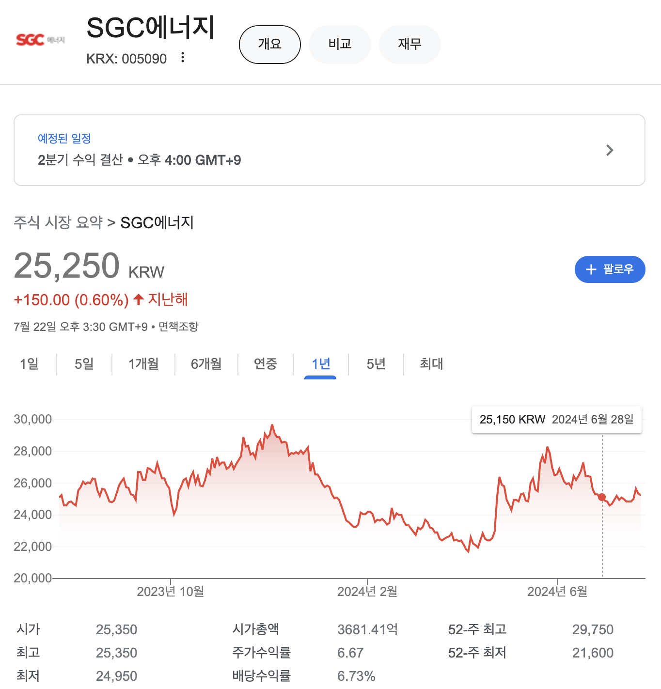 52주 최고 29,750원이었으며 52주 최저 21,600원이었습니다.