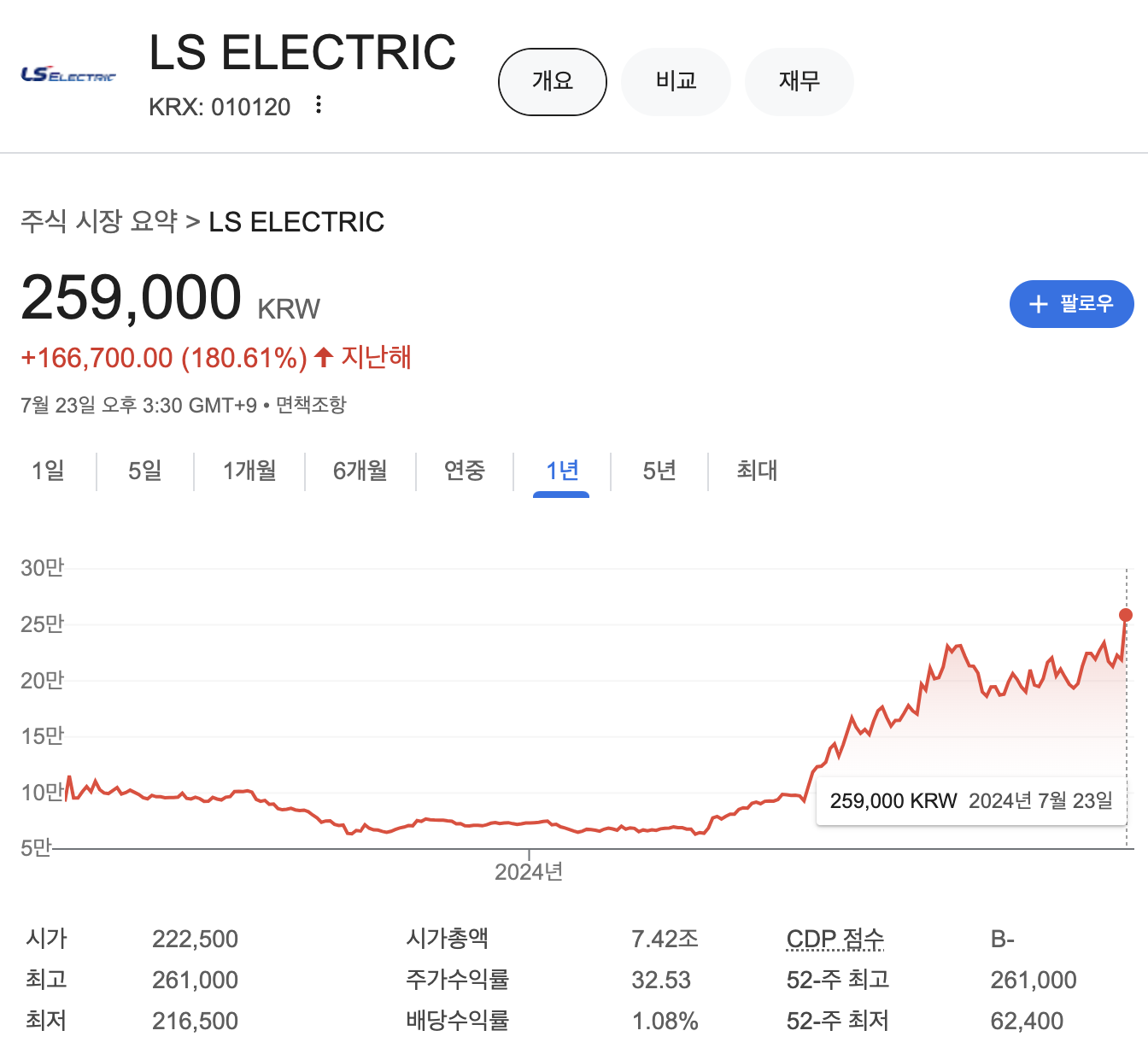 LS ELECTRIC의 주가는 지난해 1년대비 180.61% 상승해 있습니다.