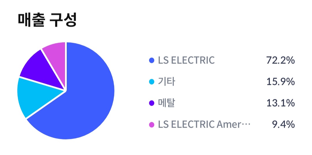 LS ELECTRIC는 LS ELECTRIC 72.2%, 기타 15.9%, 메탈 13.1%, LS ELECTRIC America 9.4%의 매출 구성을 하고 있습니다.