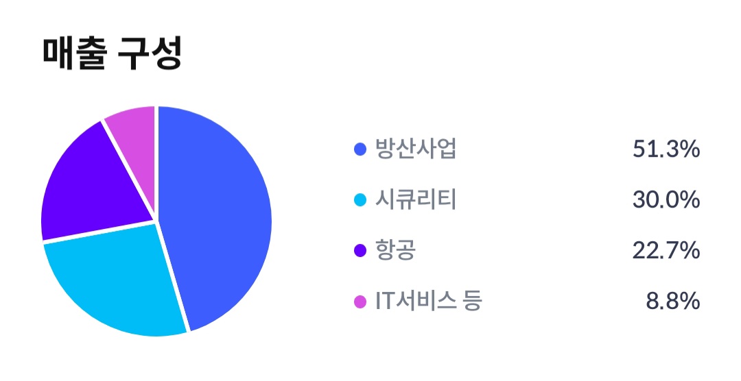매출 구성의 50%이상이 방산사업으로 구성되어 있습니다.