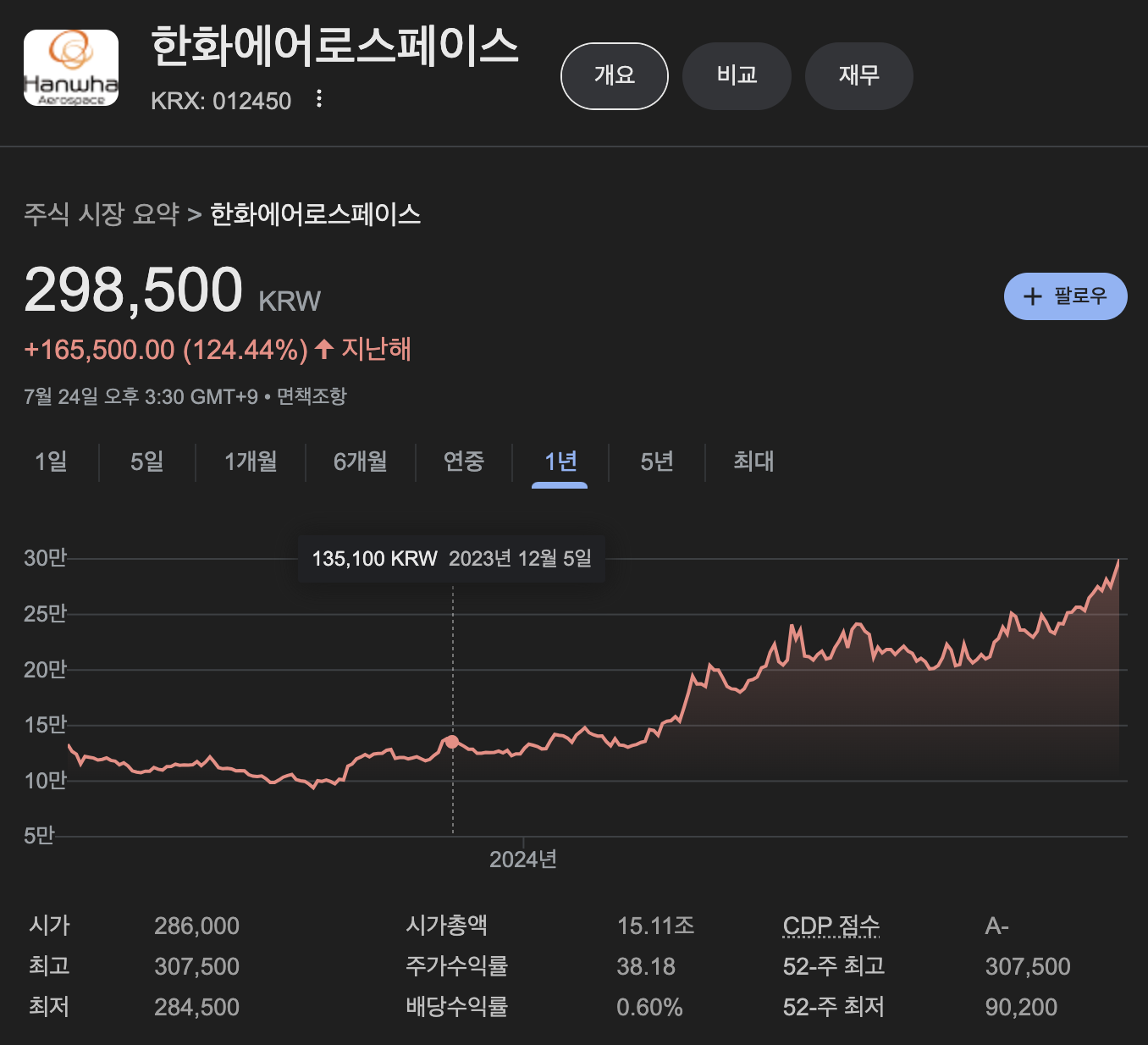 한화에어로스페이스의 주가는 지난해 1년대비 124.44% 상승해 있는 상태입니다.