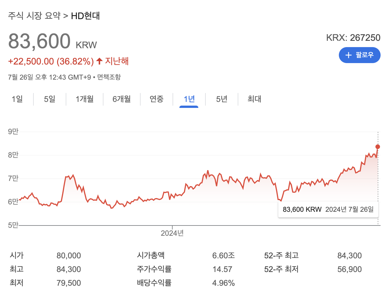 HD현대의 주가는 지난해 1년대비 36.82% 상승해 있는 상태 입니다.