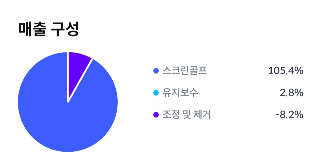 골프존은 스크린골프 105.4%, 유지보수 2.8%, 조정 및 제거 -8.2%의 매출 구성을 하고 있습니다. 매출의 50%이상이 스크린골프 105.4%로 구성되어 있습니다.