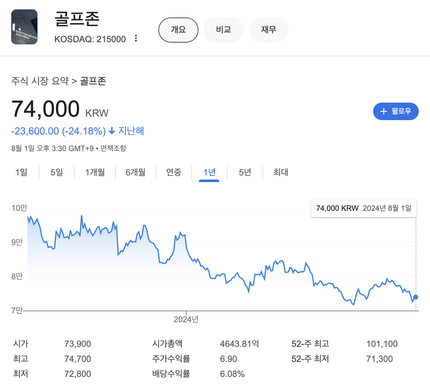 52주 최고 101,100원이었으며 52주 최저 71,300원이었습니다.