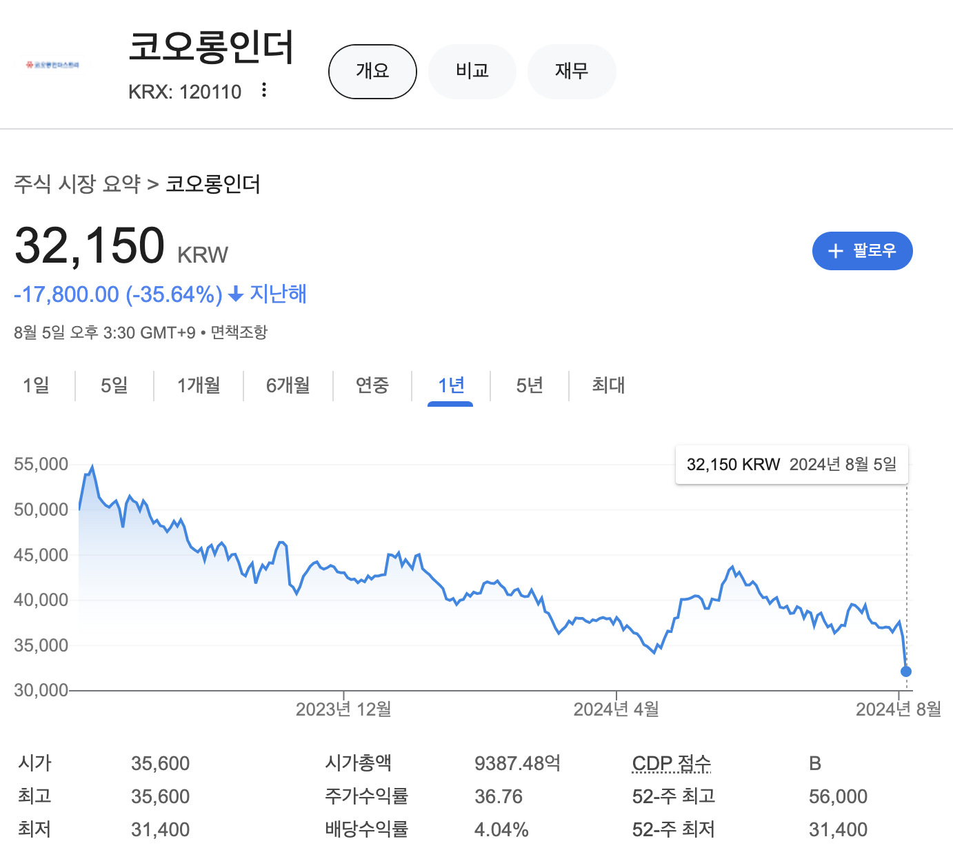 코오롱인더의 주가는 지난해 1년대비 -35.65% 하락해 있는 상태입니다.