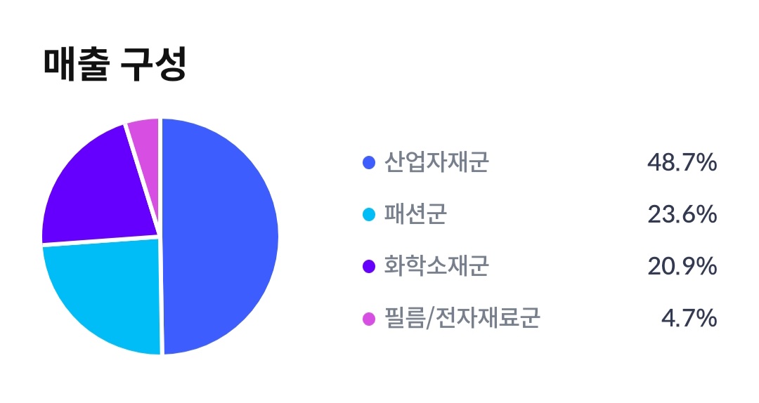 코오롱인더는 산업자재군 48.7%, 패션군 23.6%, 화학소재군 20.9%, 필름/전자재료군 4.7%의 매출 구성을 하고 있습니다.