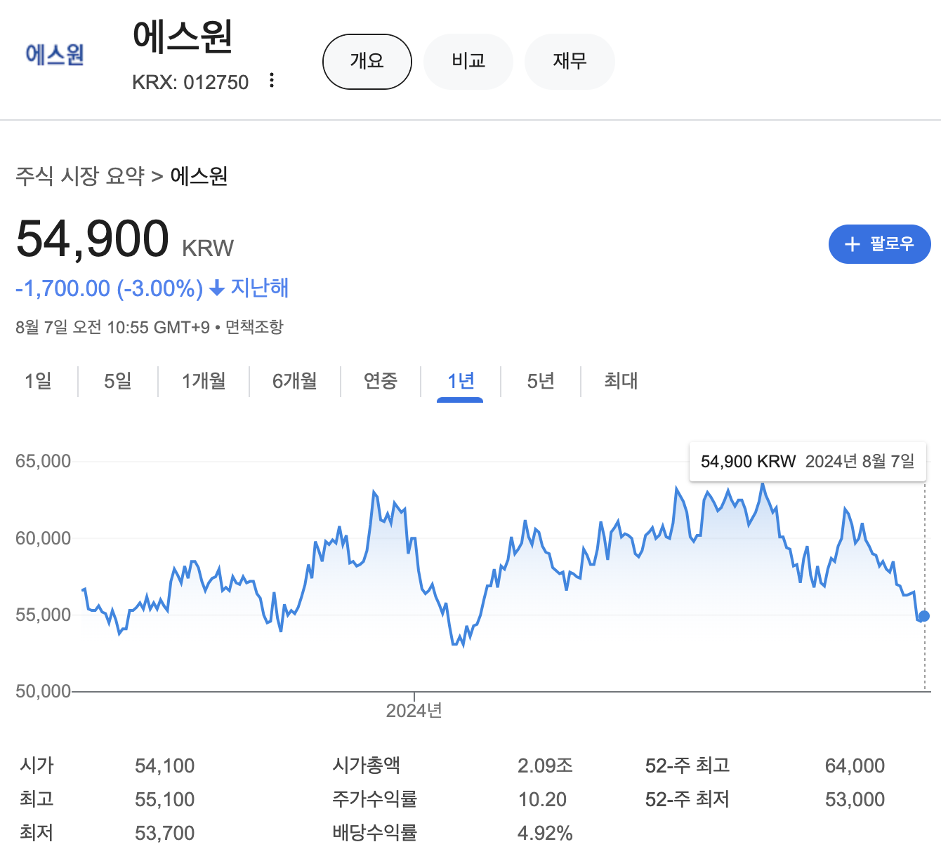 에스원의 주가는 지난해 1년대비 -3.0% 하락해 있는 상태입니다.