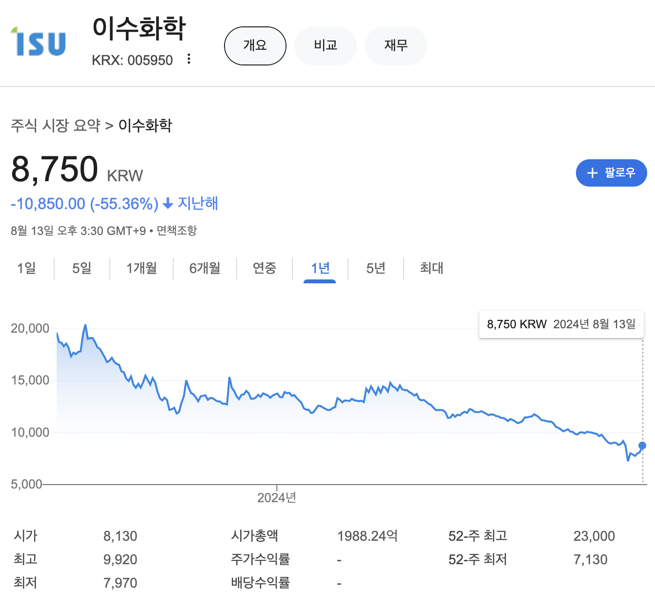 이수화학의 주가는 지난해 1년대비 -55.36% 하락해 있는 상태입니다.