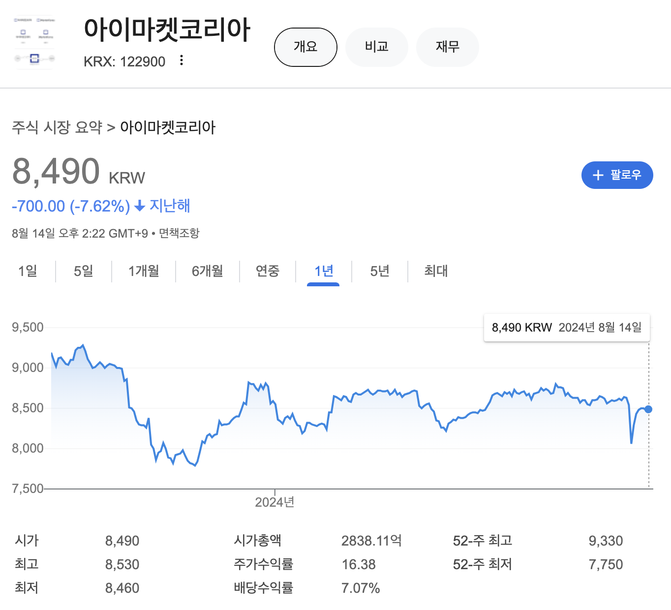아이마켓코리아의 주가는 지난해 1년대비 -7.62% 하락해 있는 상태입니다.
