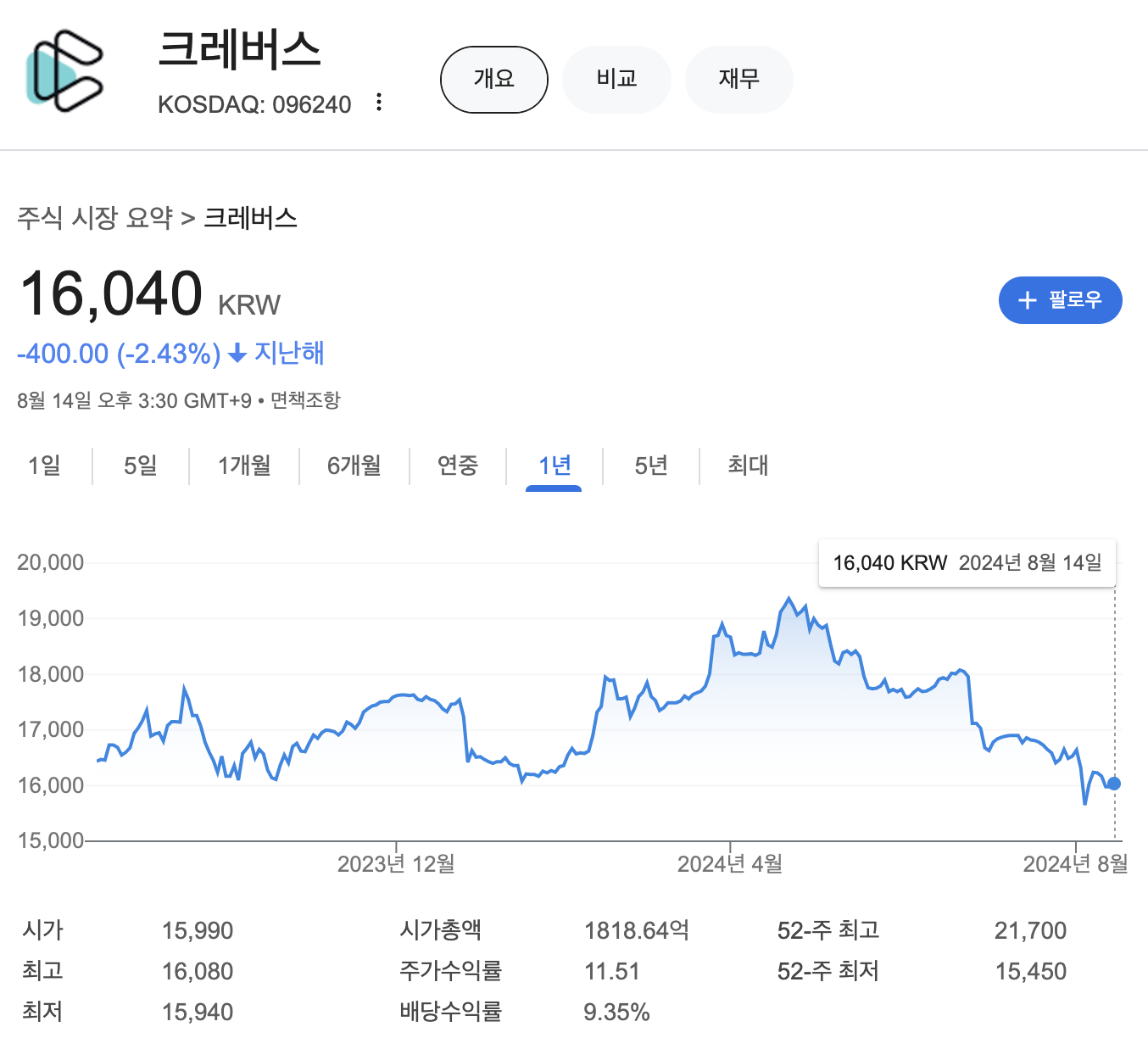 크레버스의 주가는 지난해 1년대비 -2.43% 하락해 있는 상태입니다.