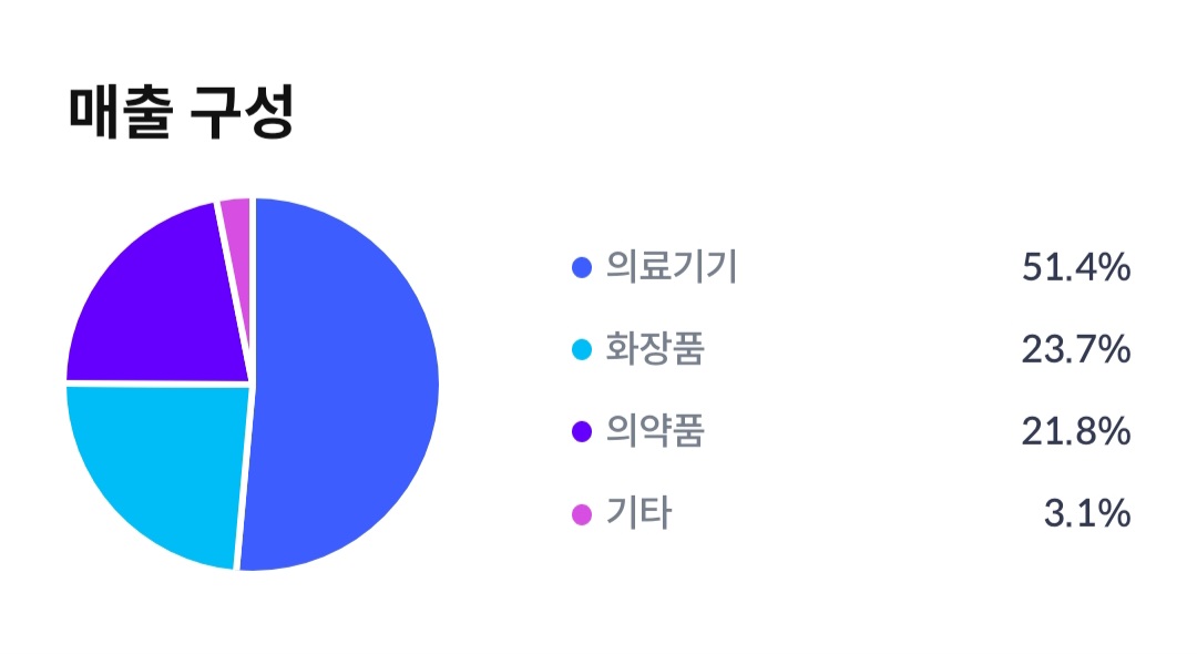 파마리서치의는 의료기기 51.4%, 화장품 23.7%, 의약품 21.8%, 기타 3.1%의 매출 구성을 하고 있습니다.