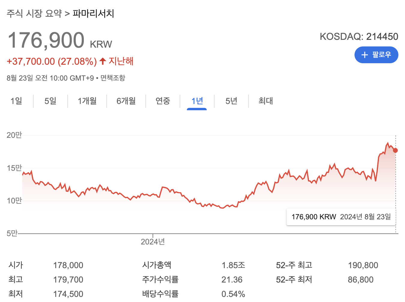 파마리서치의 주가는 지난해 1년대비 27.08% 상승해 있는 상태입니다.