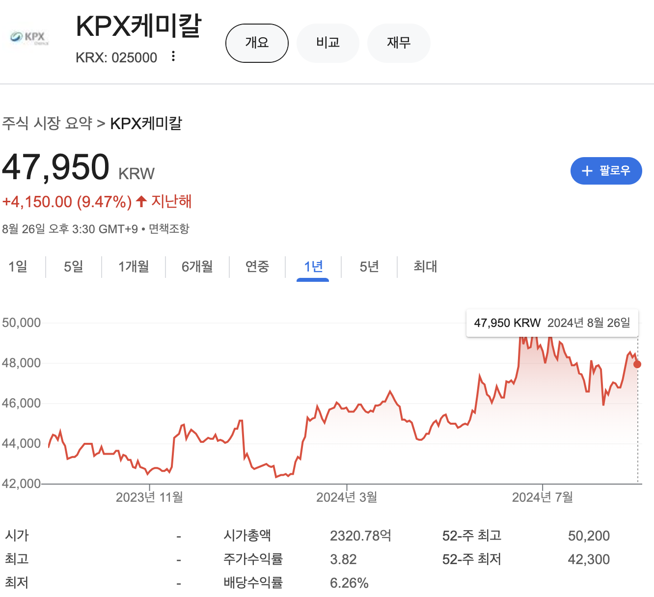 KPX케미칼의 주가는 지난해 1년대비 9.47% 상승해 있는 상태입니다.