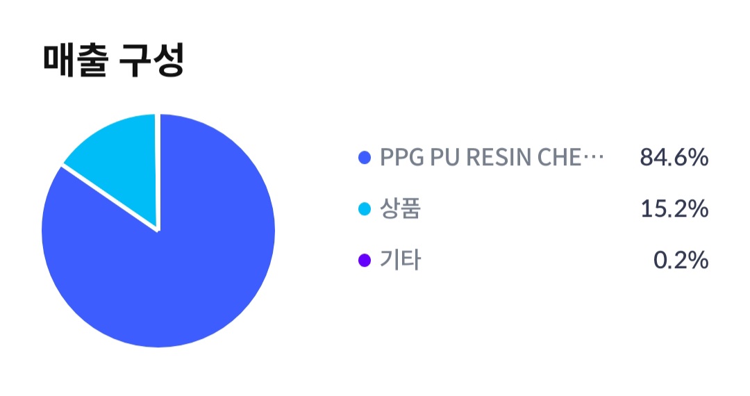 KPX케미칼은 PPG, PU, RESIM, CHEMICAL 84.6%, 상품 15.2%, 기타 0.2%의 매출 구성을 하고 있습니다. 매출 구성의 50%로 이상은 PPG, PU, RESIM, CHEMICAL 84.6%로 구성되어 있습니다.
