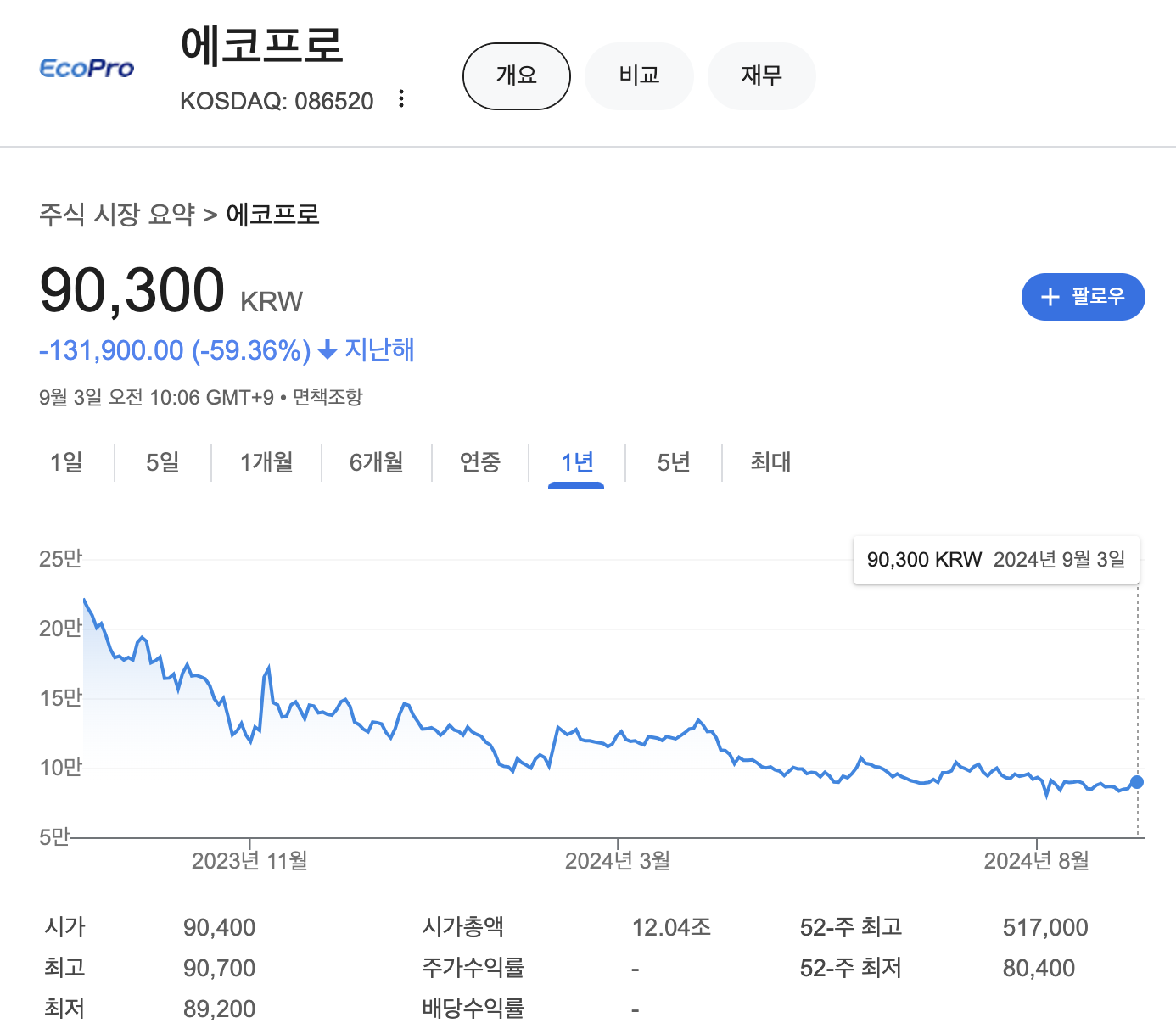 에코프로의 주가는 지난해 1년대비 -59.36% 하락해 있는 상태입니다.