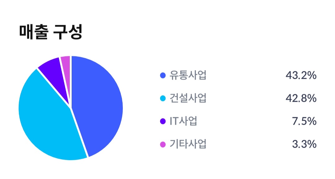 코오롱은 유통사업 43.2%, 건설사업 42.8%, IT사업 7.5%, 기타 사업 3.3%의 매출 구성을 하고 있습니다.