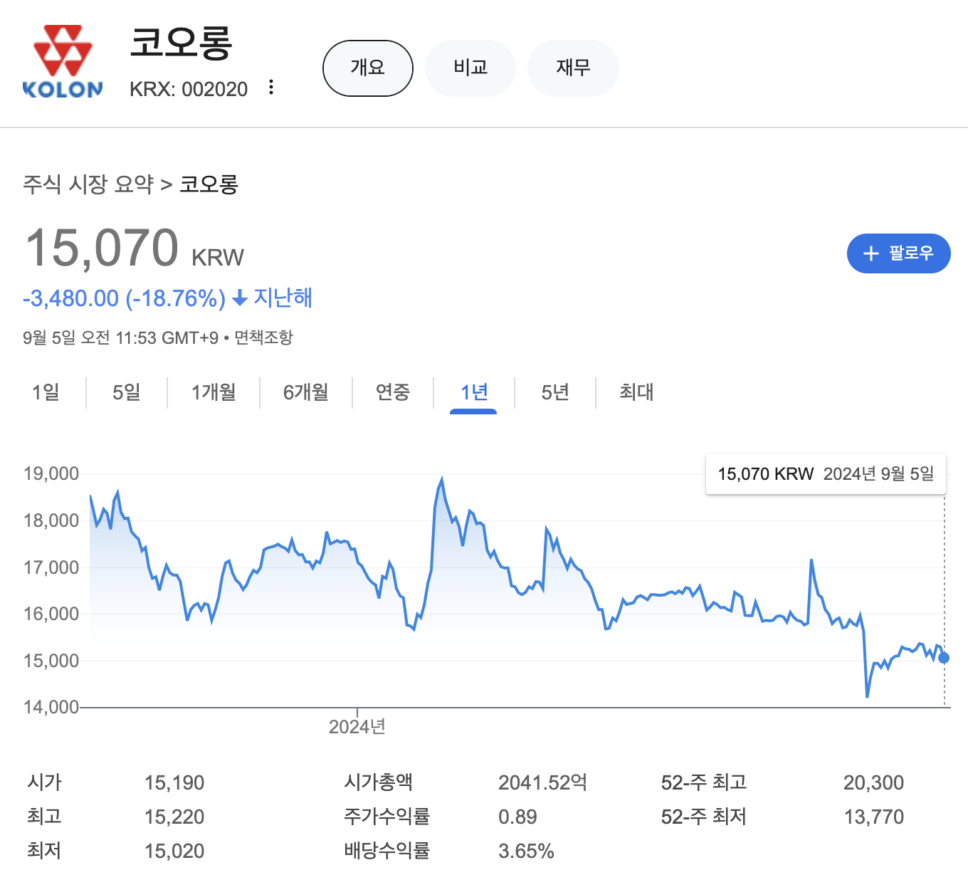 코오롱의 주가는 지난해 1년 대비 -18.76% 하락해 있는 상태입니다.