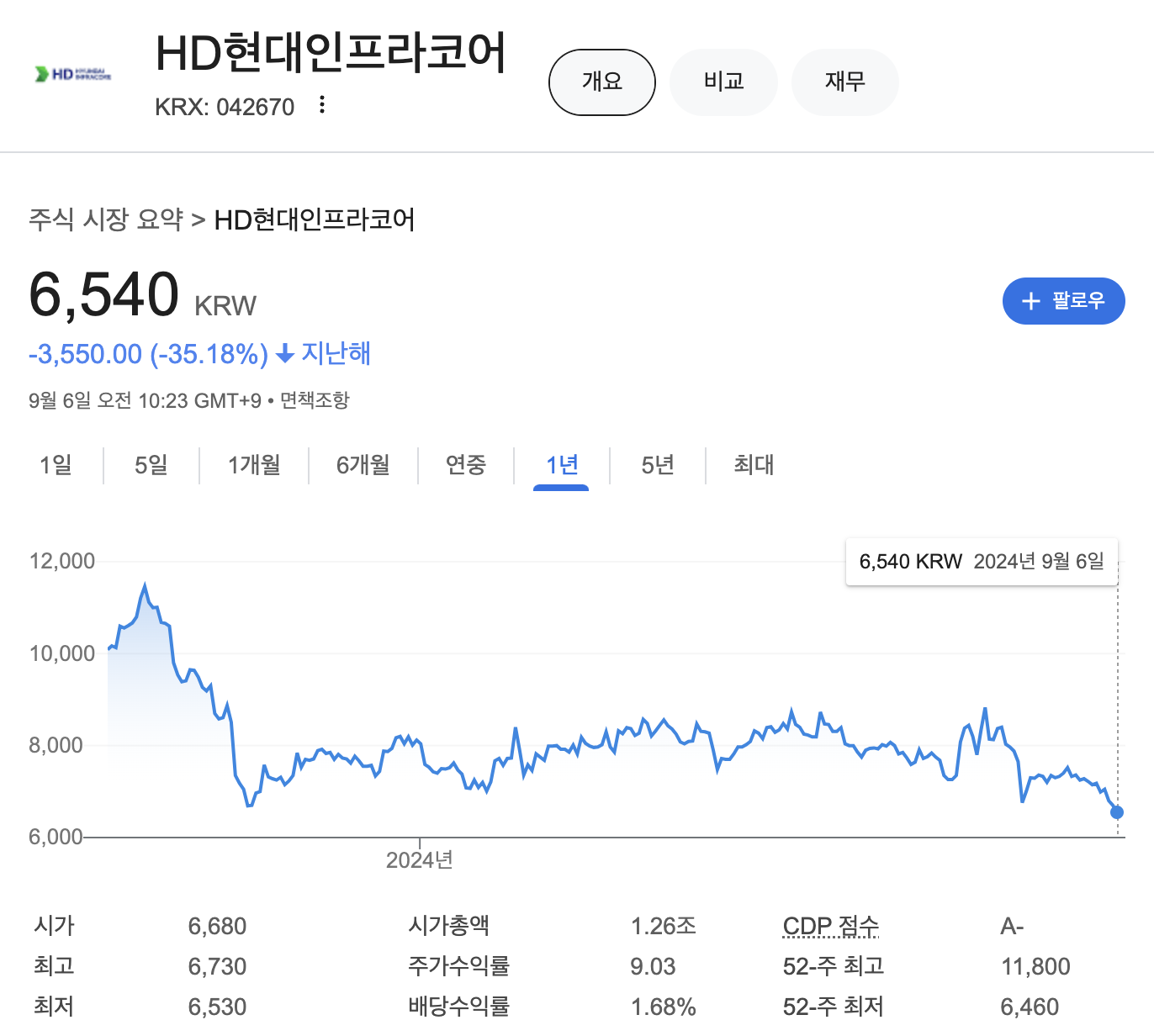 HD현대인프라코어의 주가는 지난해 1년 대비 -35.18% 하락해 있는 상태입니다.