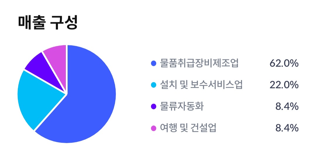 현대엘리베이는 물품취급장비제조업 62.0%, 설치 및 보수서비스업 22.0%, 물류자동화 8.4%, 여행 및 건설업 8.4%의 매출 구성을 하고 있습니다. 매출 구성의 50%로 이상 물품취급장비제조업 62.0%로 구성되어 있습니다.