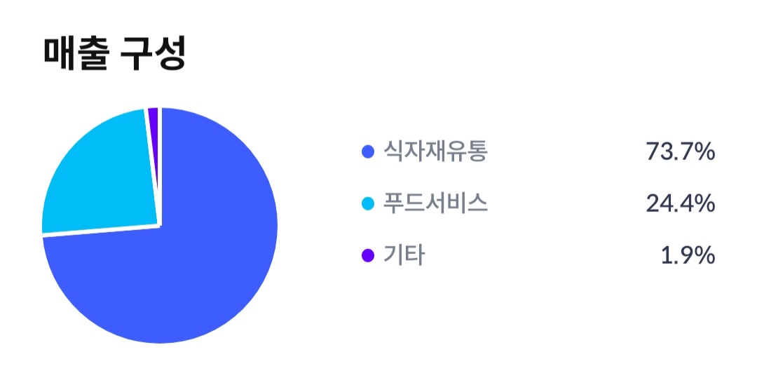CJ프레시웨이는 식자재유통 73.7%, 푸드서비스 24.4%, 기타 1.9%의 매출 구성을 하고 있습니다. 매출 구성의 50%로 이상은 식자재유통으로 73.7%를 구성하고 있습니다.