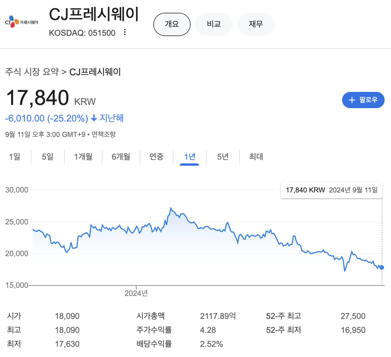 CJ프레시웨이의 주가는 지난해 1년대비 -25.20% 하락해 있는 상태입니다.