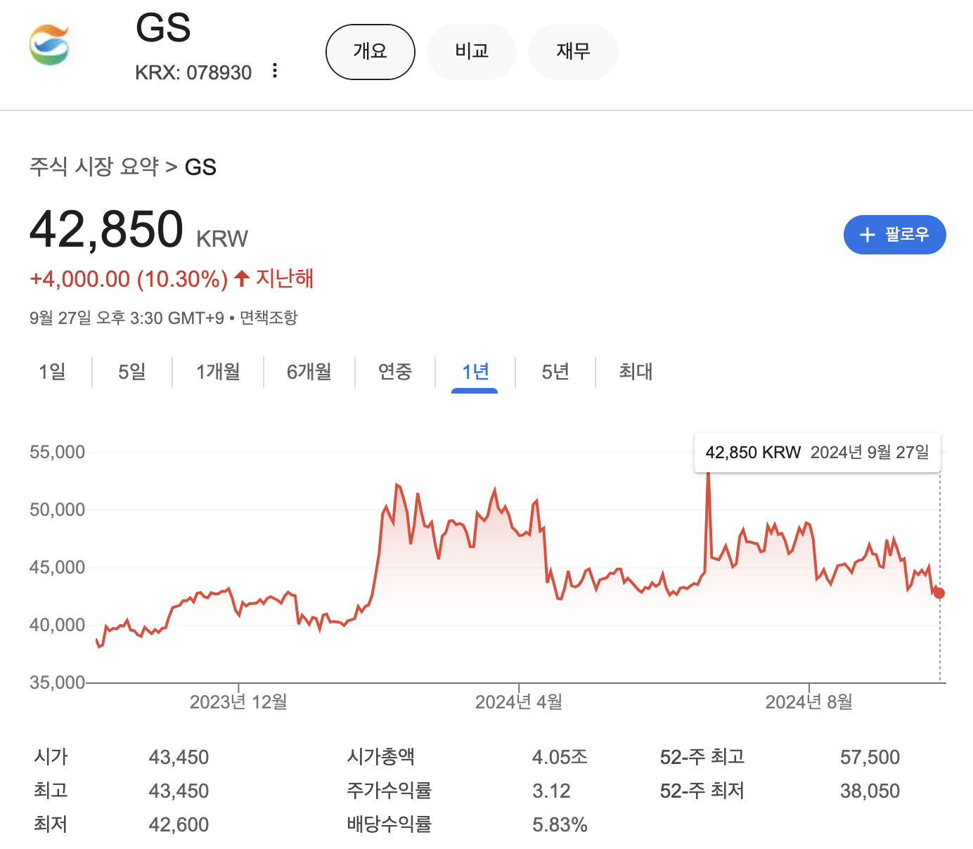 52주 최고 57,500원이었으며 52주 최저 38,050원이었습니다.