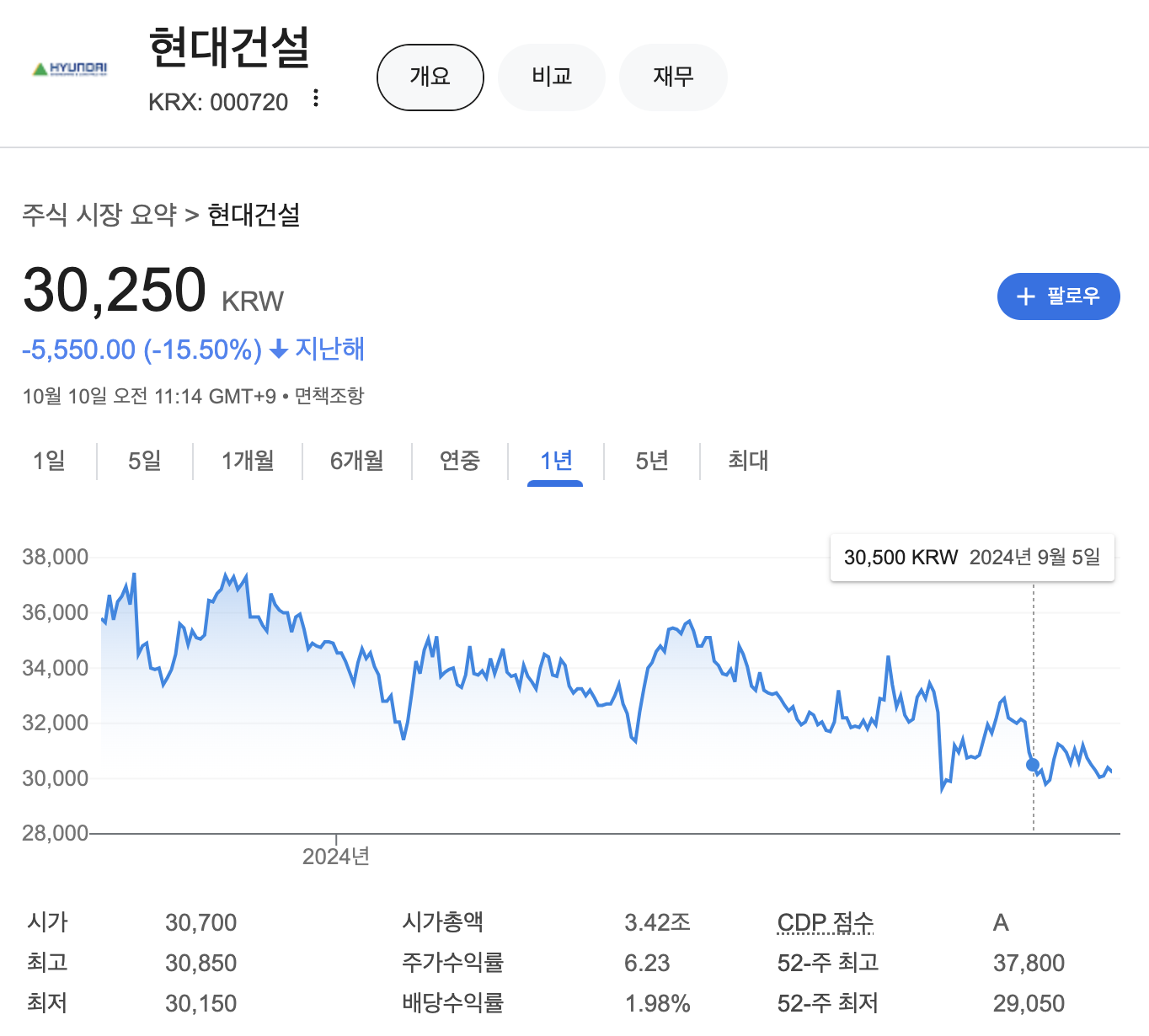 현대건설의 주가는 지난해 1년대비 -15.50% 하락해 있는 상태입니다.