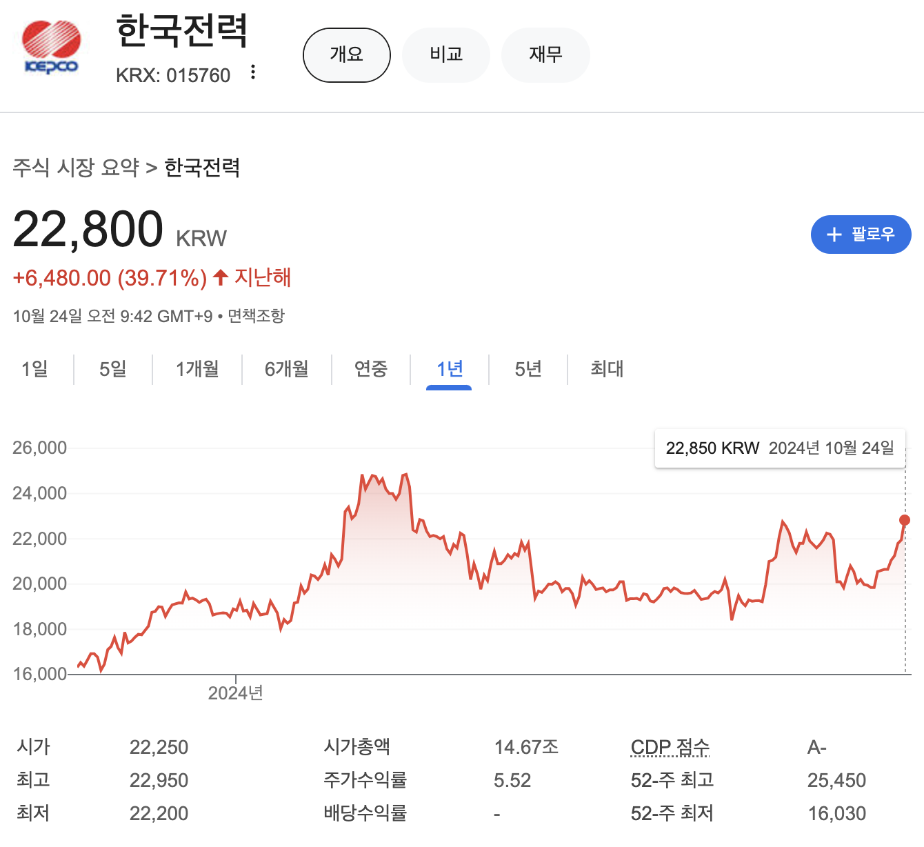 한국전력의 주가는 지난해 1년대비 39.71% 상승해 있는 상태입니다.
