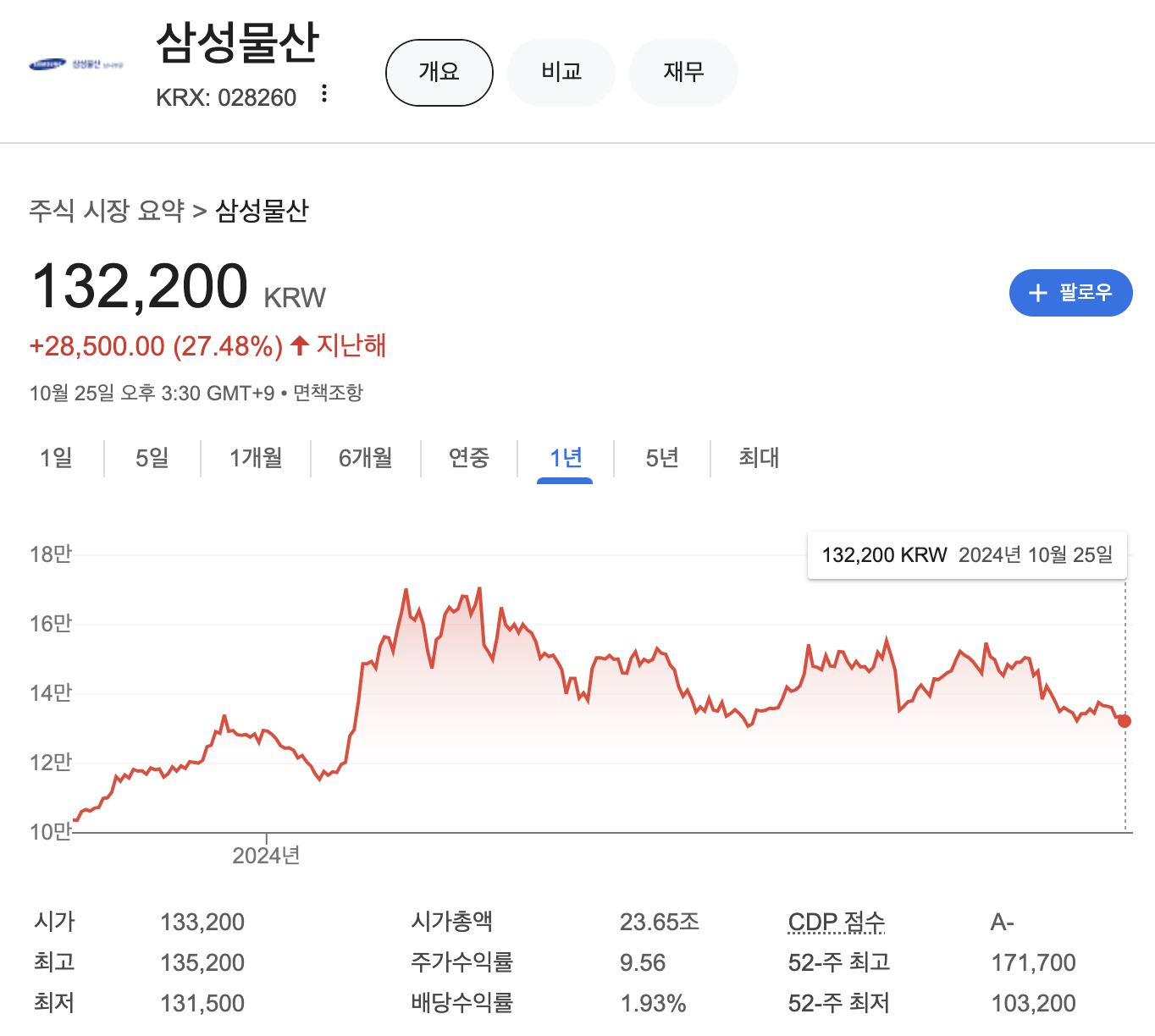 삼성물산의 주가는 지난해 1년대비 27.48% 상승해 있는 상태입니다.