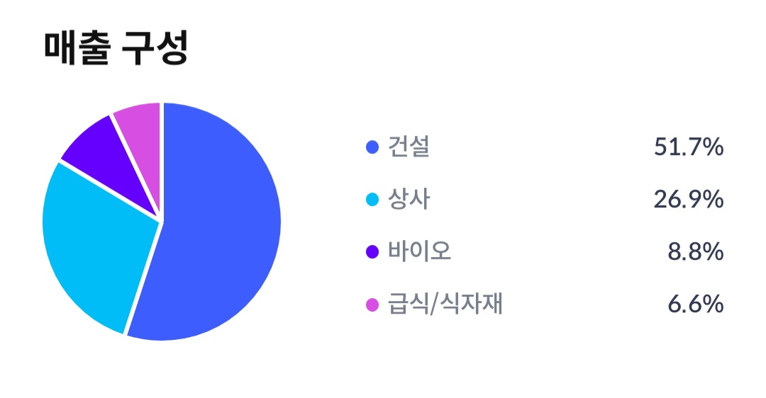 매출 구성은 건설 51.7%, 상사 26.9%, 바이오 8.8%, 급식/식자재 6.6%로 되어 있습니다.