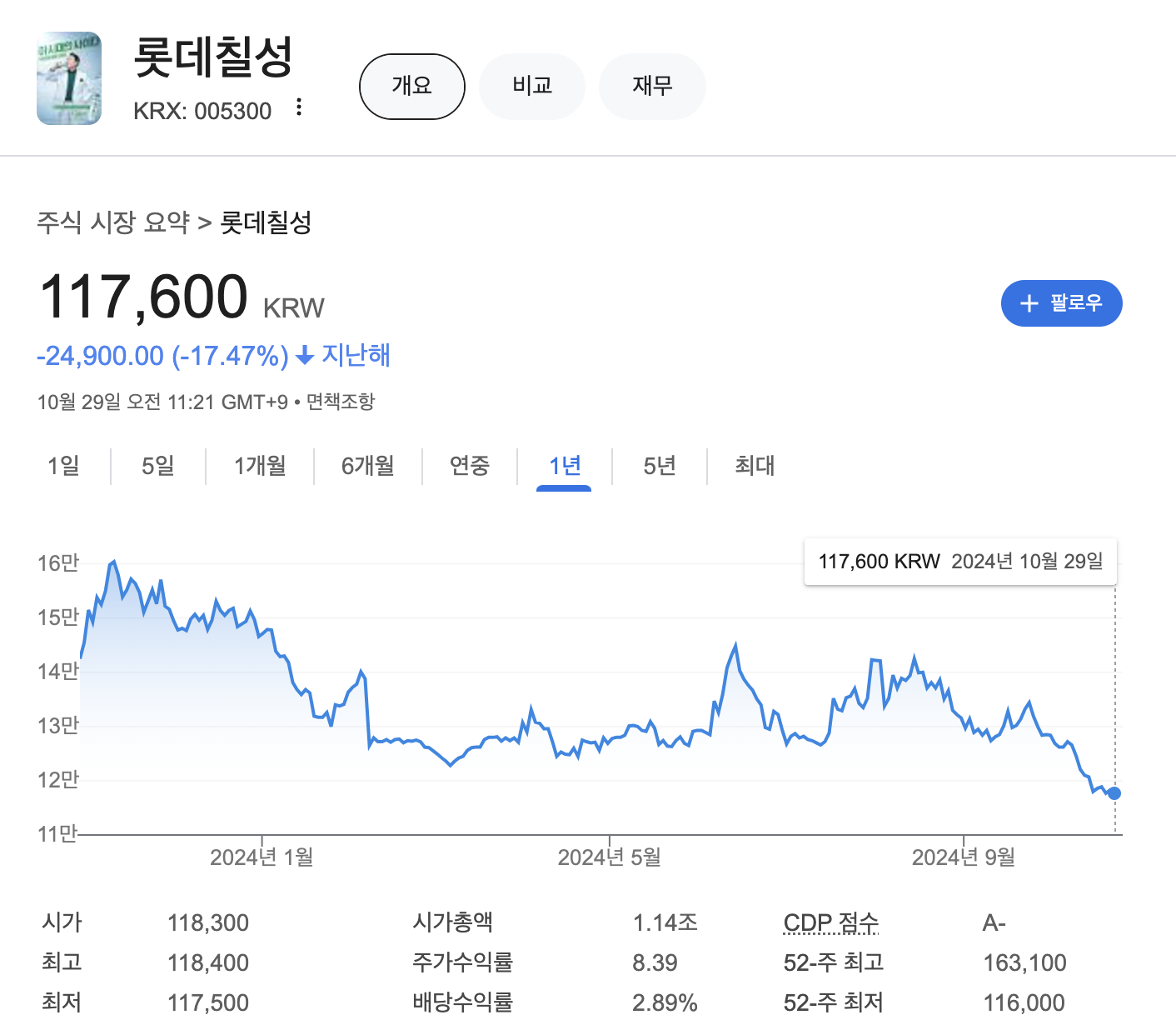 롯데칠성의 주가는 지난해 1년대비 -17.47% 하락해 있는 상태입니다.
