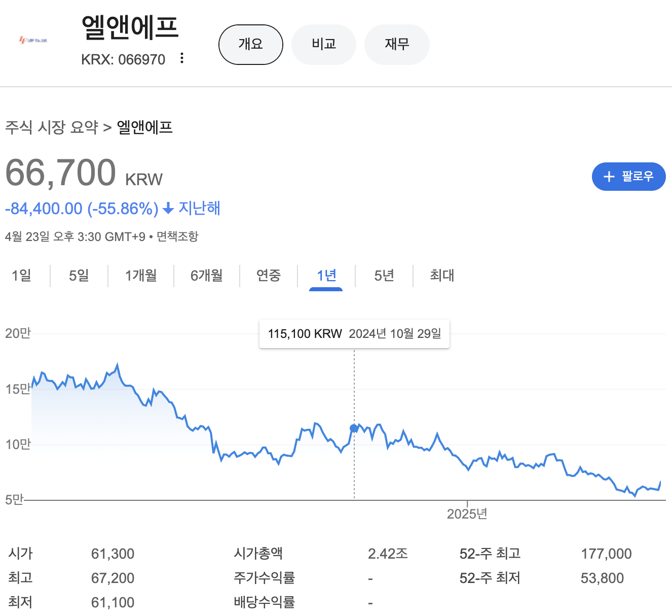 엘앤에프의 주가는 지난해 1년대비 -55.86% 하락해 있는 상태입니다.