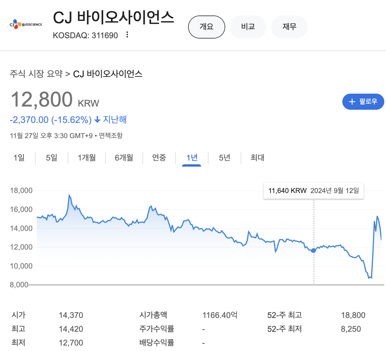 CJ바이오사이언스의 주가는 지난해 1년대비 -15.62% 하락해있는 상태입니다.