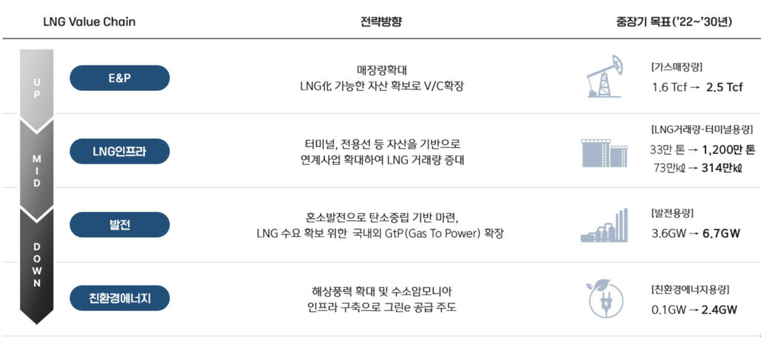 • 에너지 : 가스전 개발과 생산, 트레이딩과 운송, LNG 터미널을 통한 저장과 LNG 복합발전에 이르기까지 LNG 밸류체인 전반을 아우르는 친환경 에너지 사업을 하고 있습니다.