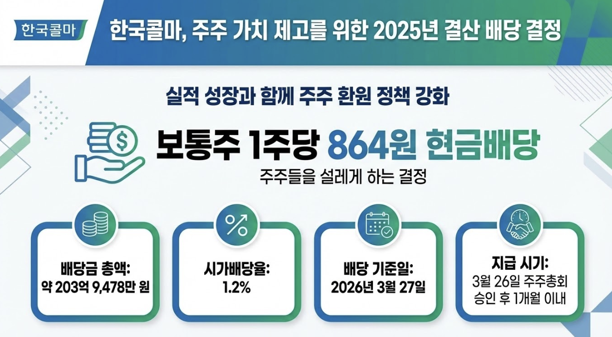 한국콜마 이사회는 보통주 1주당 864원의 결산 현금배당을 결정했습니다.