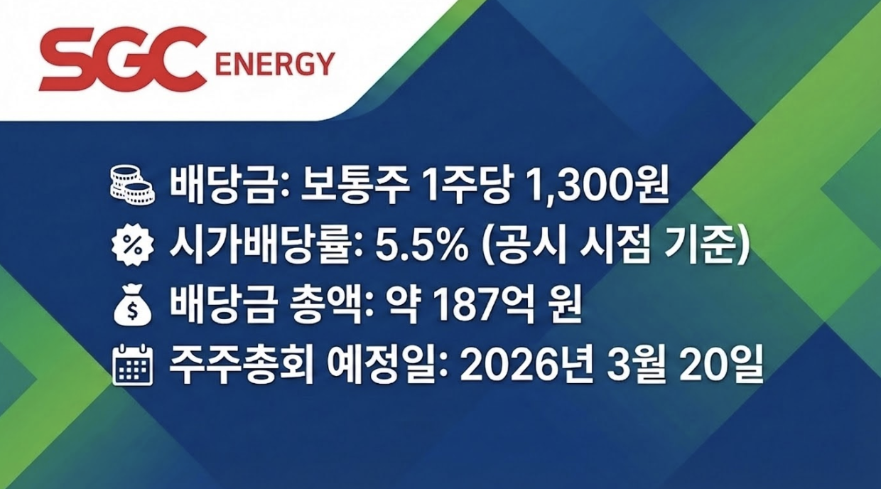 SGC에너지는 이사회를 통해 2025 사업연도 결산 배당으로 주당 1,300원의 현금 배당을 결정했습니다.