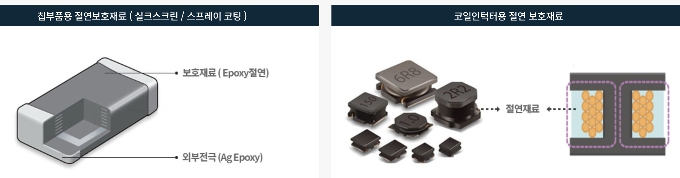 생산 제품들은 스마트폰, 노트북 등에 사용되는 칩형 전자부품에 응용되는 칩부품용 전극재료와 LED용 형광체, AMOLED 재료, 태양전지용 전극재료, 이차전지 음극재료 등이 있으며 LED용 형광체는 LG화학 형광체 사업부를 인수하여 세계 2위의 생산능력을 확보하고 있습니다.