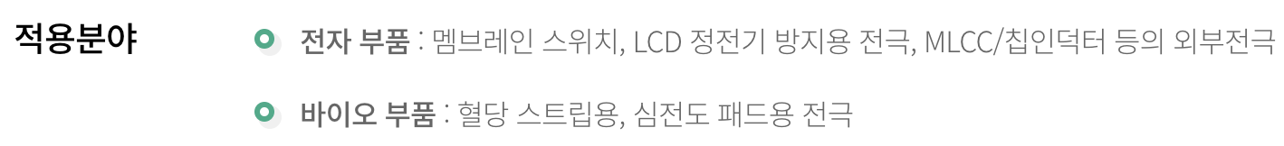 • Conductive Past : 열가소성 수지를 이용하여 필름/플렉스블 기재에 적용 가능하며, 다양한 코팅 방식용 재료 보유