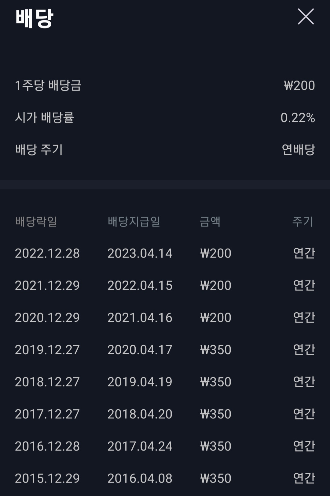 시가 배당률은 0.22% 입니다.