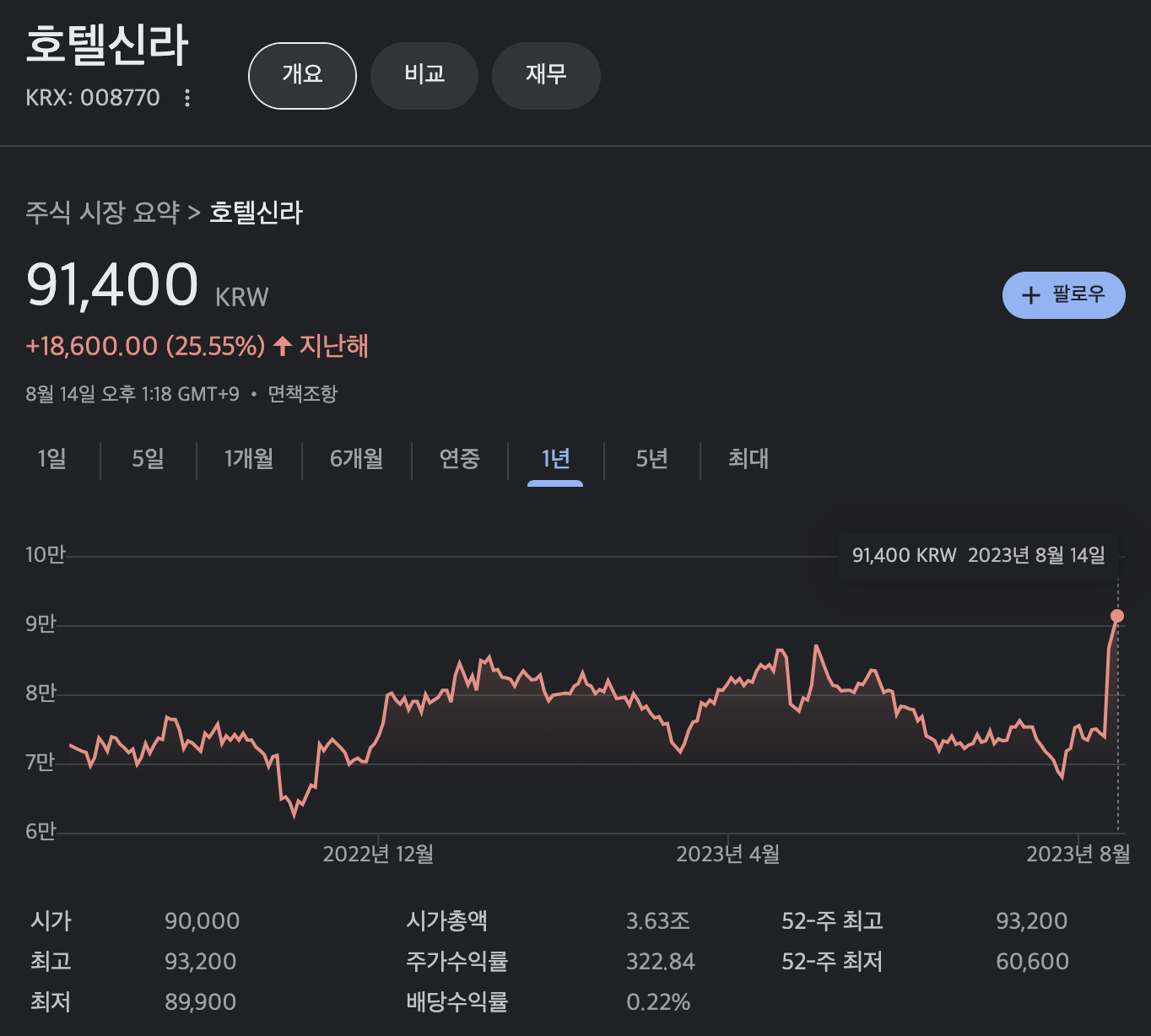 호텔신라 주가는 지난해 1년 대비 25.55%가 오른 상태 입니다.