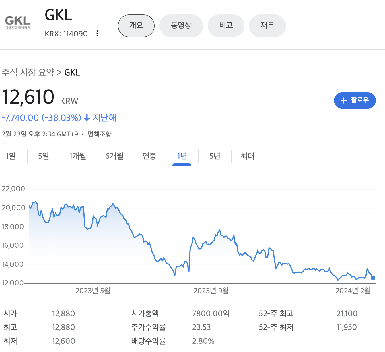 GKL 주가(2024년 2월기준)