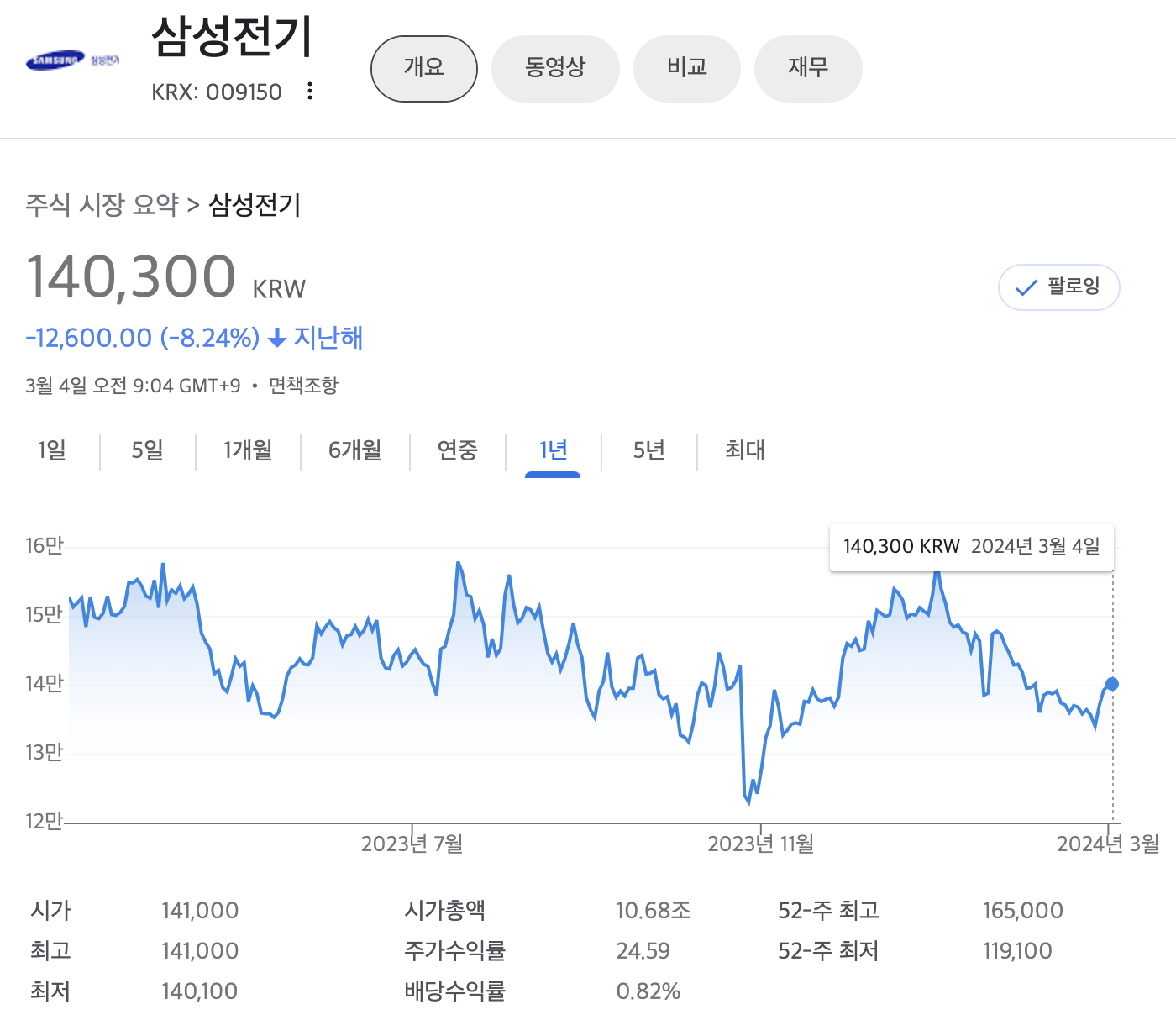 삼성전기 주가는 지난해 1년 대비 -8.24% 하락해 있는 상태입니다.