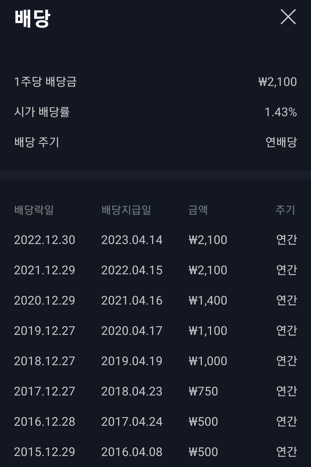 시가 배당률은 1.43%였습니다.