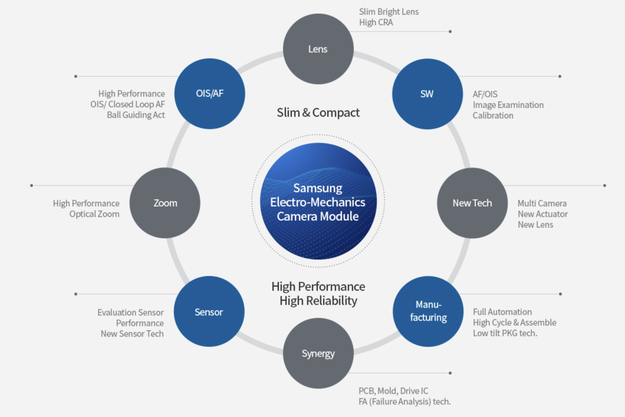 - Camera Module : 삼성전기는 Lens, Actuator, PCB 등의 핵심부품을 직접 설계 및 제작하고 있습니다. 모바일용과 자동차용 Camera Moudule을 생산하고 있습니다.