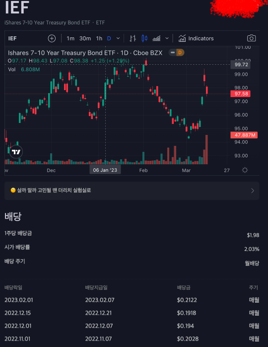 미국 배당주 월배당하는 ETF에 대해 작성해 봅니다.IEF에 대해 알아보려고 합니다. IEF는 월배당하는 미국 EFT입니다. 정식 명칭은 iShares 7-10 Year Treasury Bond ETF입니다.운영은 iSheare 자산운용사에서 운영하고 있습니다. 자산의 90% 이상을 기준 지수에 속한 미국 국채에 투자합니다. 52주 최고 109.16 달러, 52주 최저 92.89 달러현재 98.49달러로 52주 최저에 가까운 금액입니다.(2023.03.15)회당 평균 배당금은 0.1479입니다.운영 보수는 0.15%입니다.설정일은 2002년 7월 22일입니다.즉 20년이 넘은 상품입니다.미국 국채는 대표적인 안전 자산으로 분류됩니다.배당락일은 매월 1일 정도인 거 같습니다.배당지급일도 매월 7일로 보입..