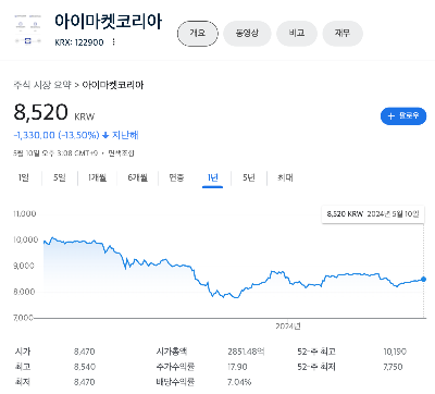 아이마켓코리아 주가는 지난해 1년대비 -13.05% 하락해 있는 상태 입니다.